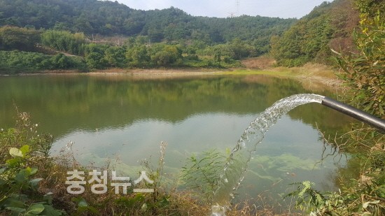 ▲ 봉산면 옥전저수지에 2017년도 농업용수확보를 위한 하천수를 담수하고 있는 모습. / 충청뉴스 최형순 기자