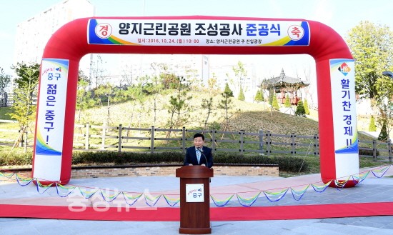 대전 중구(구청장 박용갑)는 24일 선화용두지구 재정비촉진계획에 따라 추진한 ‘양지근린공원 조성공사’를 완료하고 박용갑 청장과 김경훈 시의회 의장, 이정수 중구의회 의장 및 구의원, 지역주민 등 150여 명이 참석한 가운데 준공식을 개최했다고 밝혔다.