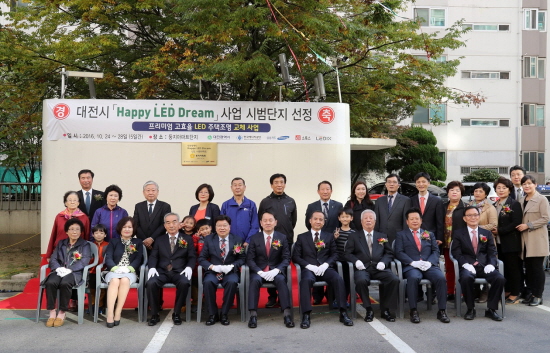 대전시가 24일 공동주택 LED 조명 확산을 위해 시범사업 대상 아파트로 선정된 가람아파트, 둥지아파트, 누리아파트와 ‘Happy LED Dream 금융모델 사업 공동협력’협약과 현판식을 진행했다고 밝혔다.