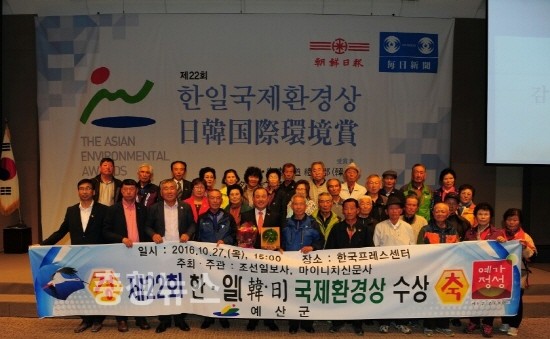 충남 예산군이 지난 27일 서울 프레스센터 국제회의장에서 열린 ‘제22회 한·일 국제환경상’에서 수상대상자로 선정되는 쾌거를 거뒀다고 밝혔다.