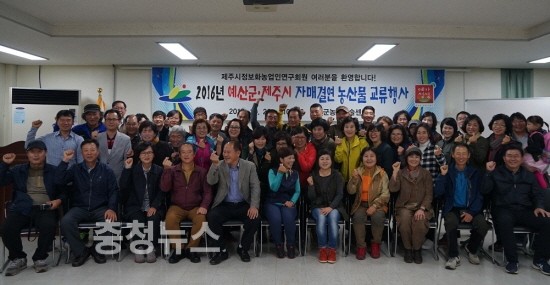 이번 행사는 예산굿팜사이버농업연구회와 제주정보화농업인연구회원 등 70여 명이 참석한 가운데 기술센터와 관내 회원 농장 및 관내 명소를 돌며 괸내 농산물과 제주지역 농산물 교류 및 우수농산물 생산정보와 마케팅을 공유 전자상거래를 활성화하기 위해 마련됐다.