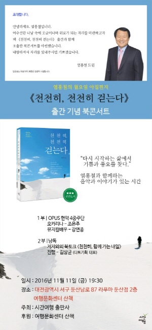 「천천히 천천히 걷는다」 출간 “다시 시작하는 삶에서 기쁨과 풍요를 찾다”라는 부제로 염홍철과 함께하는 음악과 이야기가 있는 시간을 갖는다고 전했다. 일시: 2016년 11월 11일 (금) 19:30 장소: 대전광역시 서구 둔산남로 87 라푸마 둔산점 2층 여행문화센터 산책 깊어가는 가을 염홍철 전 대전시장과 함께 힐링의 시간을 갖기 바란다. 저작권자 © 충청뉴스 무단전재 및 재배포 금지 김남숙 기자 다른기사 보기 기사가 마음에 드셨나요? 충청뉴스 좋은 기사 후원하기 1,000원 3,000원 5,000원 10,000원 30,000원 50,000원 직접입력 비회원 약관동의하기 ※ 소중한 후원금은 더 좋은 기사를 만드는데 쓰겠습니다.