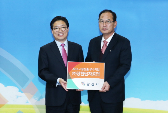 충남 당진시 부곡공단에 위치한 ㈜창환단자공업(대표 김환창, 권오천)이 2016년 일자리 창출분야 우수 기업으로 선정돼 1일 당진시로부터 고용창출 우수기업 인증서와 현판을 전달 받았다고 밝혔다.