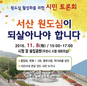 충남 서산시는 오는 6일 시청 앞 솔빛공원에서 ‘원도심 활성화 시민토론회’를 개최한다고 밝혔다.