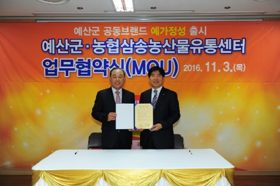 군은 이날 삼송농산물종합유통센터와 ‘예가정성’ 농산물 홍보·판매 촉진을 위한 협약을 맺고 협약에 따라 앞으로 ‘예가정성’ 농산물 온라인과 오프라인 입점지원, 홍보행사 할인행사 등 소비자 판매촉진 지원, 농산물 전략상품 개발 및 안정적인 판로 지원 등에 상호 협력하기로 했다.