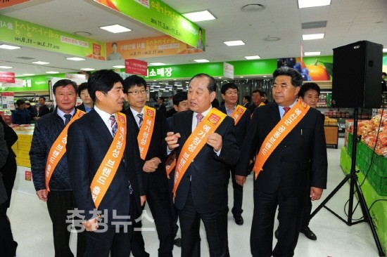▲ 황선봉 군수가 농협삼송농산물종합유통센터에서 열린 예가정성 출시행사 판촉장을 둘러보고 있다