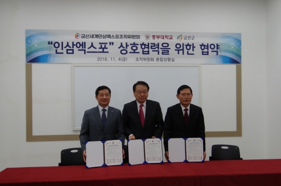 금산세계인삼엑스포조직위원회(이하 “엑스포 조직위”)가 중부대, 금산군과 상호 협약을 맺고 「2017금산세계인삼엑스포」성공개최를 위한 동력 확보에 나섰다.