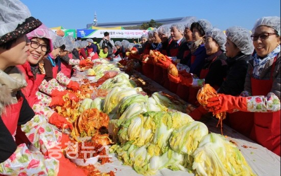 농협임직원 성금으로 운영되는 우리농업지키기운동본부(충남본부장 류병관)의 1500kg, 충남농협에서 9500kg 등을 지원받아 총 1100kg(10kg포장 1100포장박스)에 달하는 김장담그기 축제를 펼쳤다.