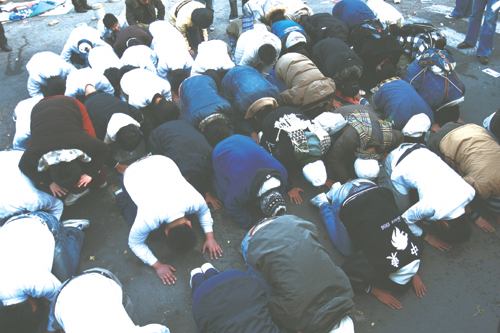 삼성동 경기고등학교 수험장을 찾은 후배들이 입실 시간이 지나 교문이 닫히자 큰절을 올리며 수험생들의 선전을 빌고 있다. 오전 8시 40분 1교시