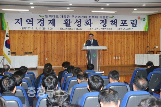 지역경제 활성화 정책포럼은 서천군이 후원하고 기업인협의회가 주관한 행사로 동백대교 개통, 장항국가산업단지 준공 가시화 등 지역내 변화와 새만금사업, 수산물유통가공특화단지 조성, 신역세권 택지개발 등 인근 지자체의 여건변화가 지역경제에 어떠한 영향을 줄 것인지 분석하고, 이러한 변화에 맞춰 지역경제에 긍정적인 효과를 줄 수 있는 정책에 대해 논의됐다.