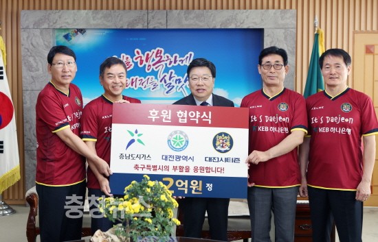 11월 14일 대전광역시청에서 열린 후원 협약식에는 대전시티즌 구단주 권선택 대전광역시장과 충남도시가스 황인규 대표이사, 대전시티즌 윤정섭 대표이사가 참석했다. ㈜충남도시가스는 협약식에서 대전시티즌에 후원금 2억원을 전달했다고 밝혔다.