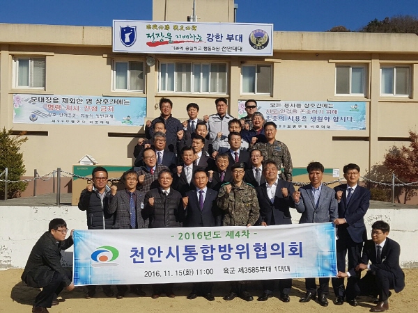 충남 천안시는 15일 천안시통합방위협의회 위원과 읍‧면‧동 방위협의회장 등 40여 명이 참석한 가운데 육군 제3585부대 1대대(대대장 이재진)에서 2016년 제4차 천안시통합방위협의회의를 개최했다고 밝혔다.