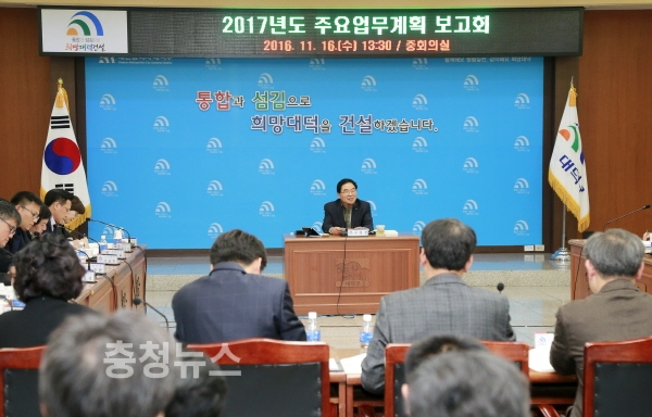 대전 대덕구(구청장 박수범)는 16일 구청 중회의실에서 간부공무원을 비롯한 직원 100여명이 참석한 가운데 2017년도 주요업무계획 보고회를 개최했다.