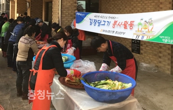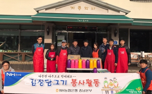 NH농협은행 충남영업본부(본부장 이강신)는 11월 17일(목) 논산시 연산면에 위치한 사회복지법인 계룡학사(원장 유창학)를 방문하여 김장담그기 봉사활동을 실시하였다.