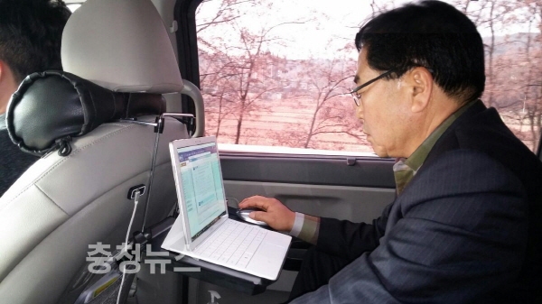 17일 박수범 대덕구청장이 외부 출장 중 차량에서 노트북을 이용해 결제업무를 처리하고 있다.