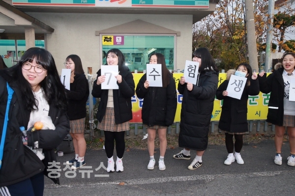 김지철 교육감, 응원 온 학생들과 함께 수능 수험생들 응원