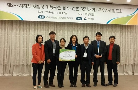 이번 경진대회는 재활용의 중요성을 알리면서 유리병, 종이팩, 발포스티렌 재활용률을 제고하고자 환경부가 주관한 것으로, 전국 각 시 ․ 도에서 선발된 17개 기초지자체가 참여해 1차 현장평가와 2차 우수사례 및 성과 발표 심사를 받으며 치열한 경쟁을 벌인 결과 영예의 대상을 수상함에 따라 2,000만원의 포상금도 받게 됐다.
