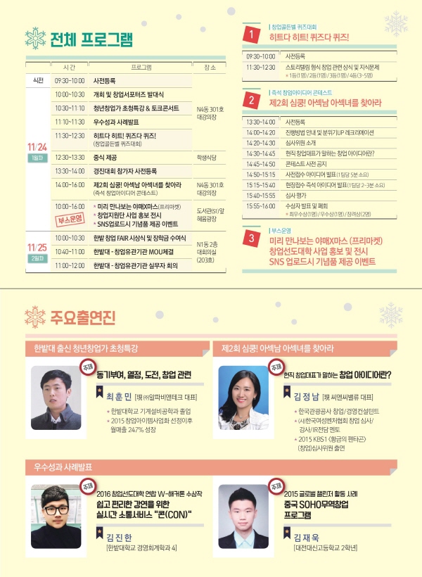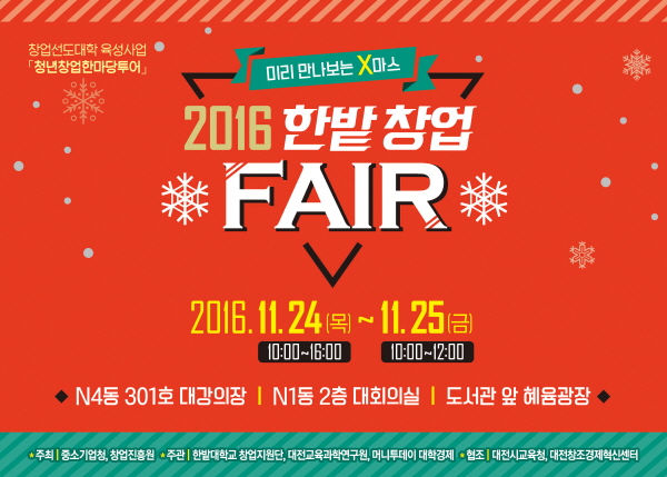 한밭대학교(총장 송하영)는 11월 24일(목)과 25일(금) 이틀동안 교내 일원에서 미리 만나보는 X마스 “2016 한밭 창업 FAIR” 행사를 개최한다.