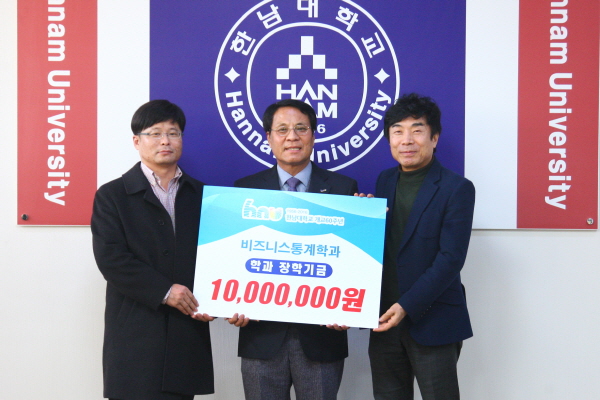 한남대 경상대학 비즈니스통계학과(학과장 김명준) 소속 교수 5명이 25일 1,000만 원의 학과장학기금을 이덕훈 총장에게 기탁했다.