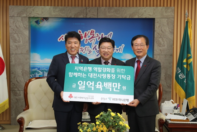 이날 행사에서 KEB하나은행 충청영그룹은 대전사랑통장 수익금 1억 6백만 원을 대전사회복지공동모금회를 통해 전달했다.
