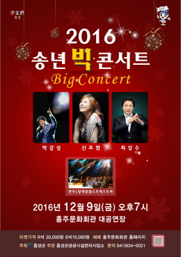 충남 홍성군 홍주문화회관은 12월 9일 오후 7시, 한국 대중음악의 거장인 ‘박강성, 신효범, 최성수’가 출연하는 “2016 송년 빅콘서트”를 개최한다.