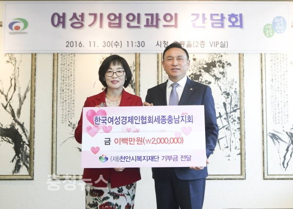 여성기업인의 애로 및 건의사항 청취 등으로 진행된 이날 간담회는 여성기업인 16명이 참석했으며, 복지 사각지대에 있는 소외계층을 위해 써 달라며 천안시사회복지재단에 200만원의 기부금을 전달했다.