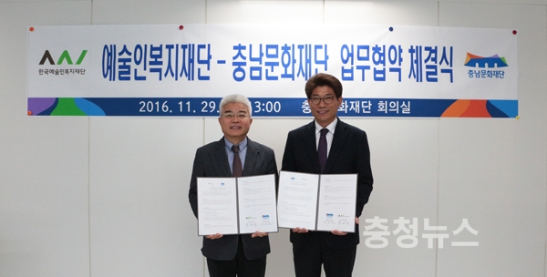 충남문화재단(대표이사 이종원)은 29일 충남지역 예술인 복지발전을 위해 충남문화재단 회의실에서 한국예술인복지재단과의 업무협약을 가졌다.
