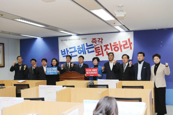 천안시의회 더불어민주당 소속 11명의 의원이 30일 천안시청 브리핑실에서 박근혜 대통령의 즉각 퇴진을 요구하는 시국선언문을 발표했다.