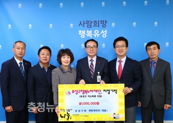 <사진자료 1> 대전 유성구 청렴동아리 ‘비움’(회장 김신환, 유성구 감사실장)이 5일 구청 행복사랑방에서 저소득계층 지원을 위해 써달라며 100만원의 후원금을 유성구행복누리재단에 지정 기탁한 가운데, 허태정 유성구청장(오른쪽 1번째), 김신환 청렴동아리 회장(오른쪽 2번째), 김홍혜 유성구행복누리재단 이사장(오른쪽 3번째)이 기념사진을 찍고 있다.