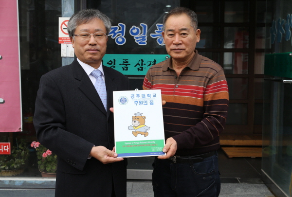공주대학교 발전기금 후원의 집으로 참여한 “정일품삼겹살” 업소는 공주시 옥룡동에 위치하고 있으며, 매월 일정금액을 3년에 걸쳐 공주대 발전기금으로 기탁하기로 약정했다.