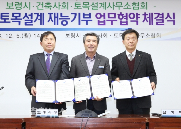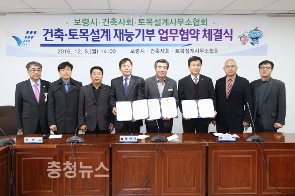 충남 보령시는 5일 오후 2시 시청 상황실에서 김동일 시장과 건축사회 남기덕 회장, 토목설계사무소협회 강선규 회장 등 관계자가 참석한 가운데 어려운 가정과 재난 피해 가구 대상자가 복구를 위한 건축·측량 시, 무료 설계를 지원키로 하는 재능기부 업무협약을 체결했다.