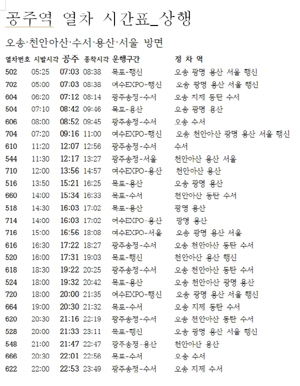공주시(시장 오시덕)에 따르면, 공주역 SRT 운행시간은 상행 오전 7시 12분을 시작으로 오후 10시 53분까지 10회, 하행은 오전 6시 38분을 시작으로 오후 10시 17분까지 8회 등 총 18회가 정차한다고 밝혔다.