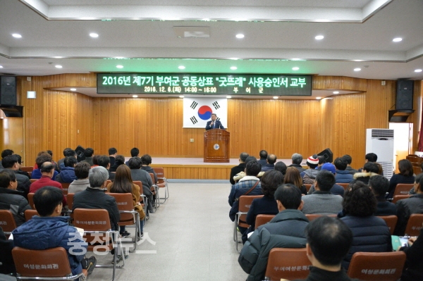 충남 부여군(군수 이용우)은 지난 6일 여성문화회관 대강당에서 제7기 부여군공동상표 ‘굿뜨래’ 사용조직에 대해 사용승인서를 교부하고, 혁신체계구축 교육을 실시했다.