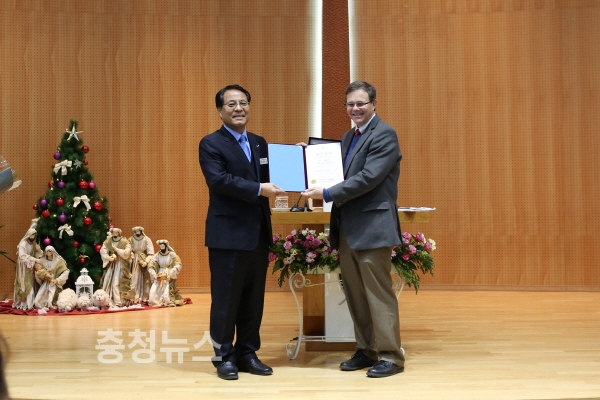 7일 한남대 이덕훈 총장이 ‘스토니 포인트 센터’ 어포드-체이스 공동대표에게 한남인돈문화상을 수여하고 있다.