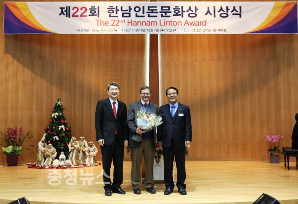 7일 한남인돈문화상 시상식을 마치고 한남대 이덕훈 총장(사진 오른쪽)과 ‘스토니 포인트 센터’ 어포드-체이스 공동대표(가운데), 한남대 천사무엘 교목실장(왼쪽)이 기념 사진을 촬영하고 있다.