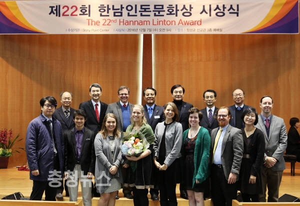 7일 한남인돈문화상 시상식을 마치고 한남대 이덕훈 총장(사진 뒷줄 왼쪽 네번 째)과 ‘스토니 포인트 센터’ 어포드-체이스 공동대표(뒷줄 왼쪽 세번 째)가 기념 사진을 촬영하고 있다.