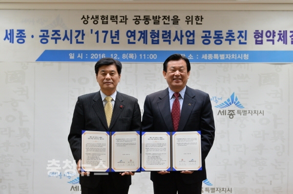 충남 공주시(시장 오시덕)와 세종특별자치시(시장 이춘희)가 8일 오전 11시 세종특별자치시청에서 2017 지역행복생활권 연계협력사업 공동추진 협약을 체결했다고 밝혔다.