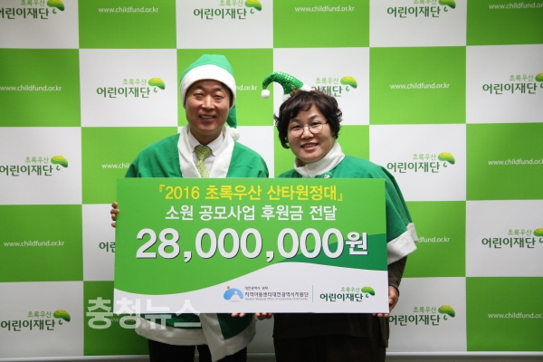 초록우산어린이재단 대전지역본부(본부장 함영신)는 12월 8일 오전 서구 둔산동 초록우산어린이재단 대전지역본부 회의실에서 지역아동센터 대전광역시지원단(단장 윤종선)에게 “2016 초록우산 산타원정대-복면산타가 간다” 소원 공모사업비 2800만원을 전달했다.