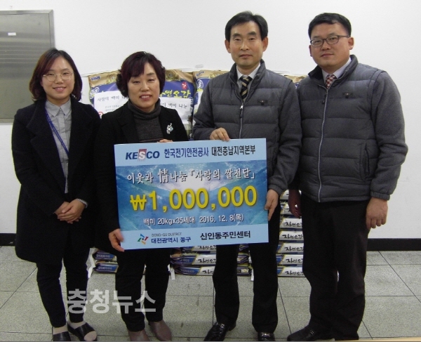 국전기안전공사 대전충남지역본부(본부장 이범욱)는 8일 대전광역시 동구 인동과 신흥동 소재 저소득소외계층 세대를 대상으로 이웃과 情(정)나눔 ‘사랑의 쌀 전달’후원행사를 전개했다.