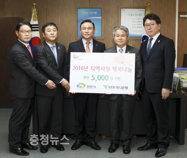 KEB하나은행 천안중앙지점(지점장 정근수)은 9일 천안시를 방문하여 난방비 문제로 어려움을 겪고 있는 이웃들을 위하여 사랑의 연탄 5000장(300만원 상당)을 기부했다.