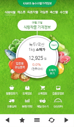 KAMIS 농수산물가격정보 앱(App)은 전국의 19개 지역, 61개 시장의 주요 농축수산물의 일일 도·소매가격정보에서 거래동향 및 분석정보에 이르기까지 농축수산물 유통과 관련한 다양하고 특화된 정보를 시의성 있게 제공하고 있다.