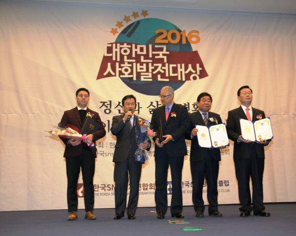 이충재 행복청장(우측)이 13일(화) 10:00, 국회 헌정기념관에서 열린 ‘2016년 대한민국 사회발전대상’ 시상식에 참석하여 행정부문 대상을 받고 있다.