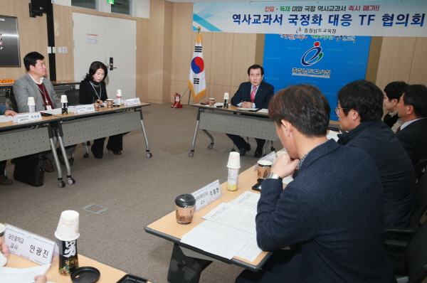충남교육청(교육감 김지철)이 13일 오후 도교육청 회의실에서 역사교과서 국정화 대응 TF 협의회를 개최하고 역사교과서 국정화에 강력히 반대하는 입장을 밝히는 한편 교육부의 국정화에 추진에 협조하지 않기로 하는 등 기존의 입장을 재확인했다.