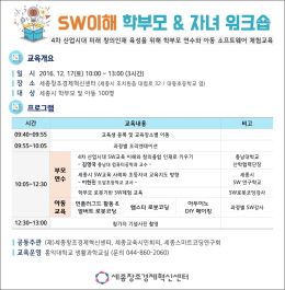 세종창조경제혁신센터(센터장 최길성)는 12월 17일(토) 관내 학부모와 아동 100여 명을 대상으로 'SW이해 학부모-자녀 워크숍' 을 개최한다.
