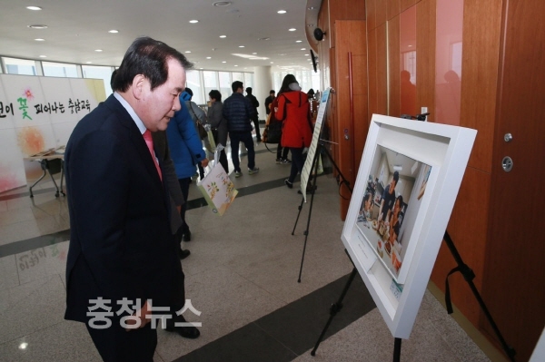 김지철 충남교육감이 충남도청 문예회관에 마련된 인권자료 전시장을 둘러보고 있다.