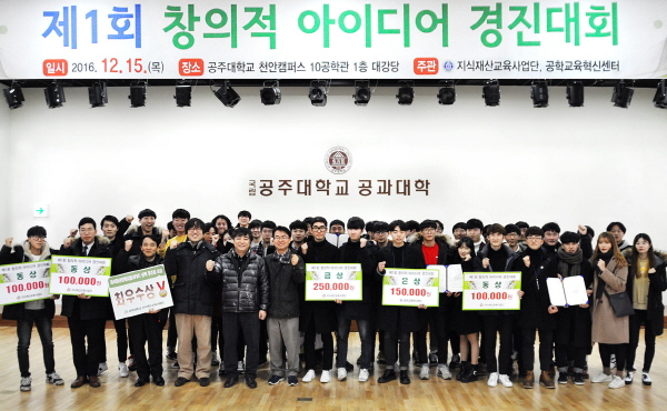 공주대학교 지식재산교육사업단(단장 김문정)과 공학교육혁신센터(학장 최병관) 공동주관으로 지식재산 중심「창의적 아이디어 경진대회」가 공과대학 재학생들을 대상으로 15일 공주대학교 공과대학 천안캠퍼스에서 개최됐다.