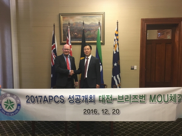 대전광역시(시장 권선택)가 20일 자매도시 호주 브리즈번과 2017 아·태 도시정상회의(APCS)의 성공적인 개최를 위해 업무협약(MOU)를 체결했다고 밝혔다.