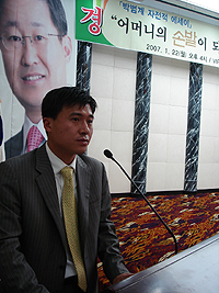 ▲ 박범계변호사 박변호사는 '어머니의 손발이 되어'라는 책을 출판하게 된 사연을 참석자들에게 소개했다 그는 대전 서구을 국회의원 경선에서 패한 7개월 만에 어머니가 와병으로 시한부인생을 살고 계시다 2개월 만에 운명하셨다 면서 그는 병상에 계신 어머니 귀에 속삭였던 일을 밝혔다. 그는 당시 어머니에게 이 땅에 힘없는 사람을 위해서 제 삶을 살겠다는 약속을 드리겠다. 는 약속을 반드시 지키겠다고 밝혀 4.25보궐에 필승을 다짐했다. 박변호사는 구논회 의원의 유가족과 지지자들에게 심심한 위로를 드린다고 말하고 앞으로 당차게 살겠다고 선거를 앞두고 자신감을 보여 줬다 이날 참석한 주요인사 문정인 전 청와대 민정수석.여인철.김주팔 대훈서적대표.김주일 금성건설회장.박세용 중원상조회장.안정원 서구미용사 협회 회장.양희권 페리카나회장과 변호사들과 지지자들이 대거 참석했다. ▲ 김종천 사무국장