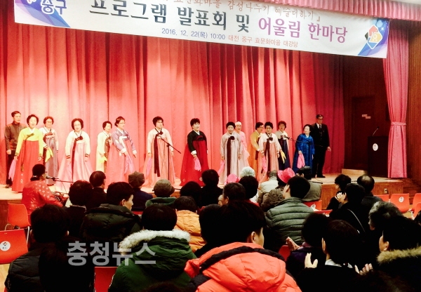 대전 중구(구청장 박용갑)는 22일 효문화마을 대강당에서 프로그램 참여자 및 관람객 300여 명이 참석한 가운데 ‘프로그램 발표회 및 어울림 한마당’을 개최했다.