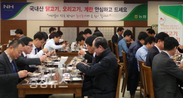 농협 충남지역본부(본부장 유찬형)는 고병원성 조류인플루엔자(AI) 확산으로 어려움을 겪고 있는 양계농가를 돕기 위해 23일 충남농협 구내식당에서 삼계탕 시식행사를 실시하였다.